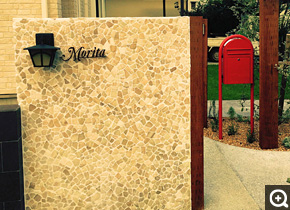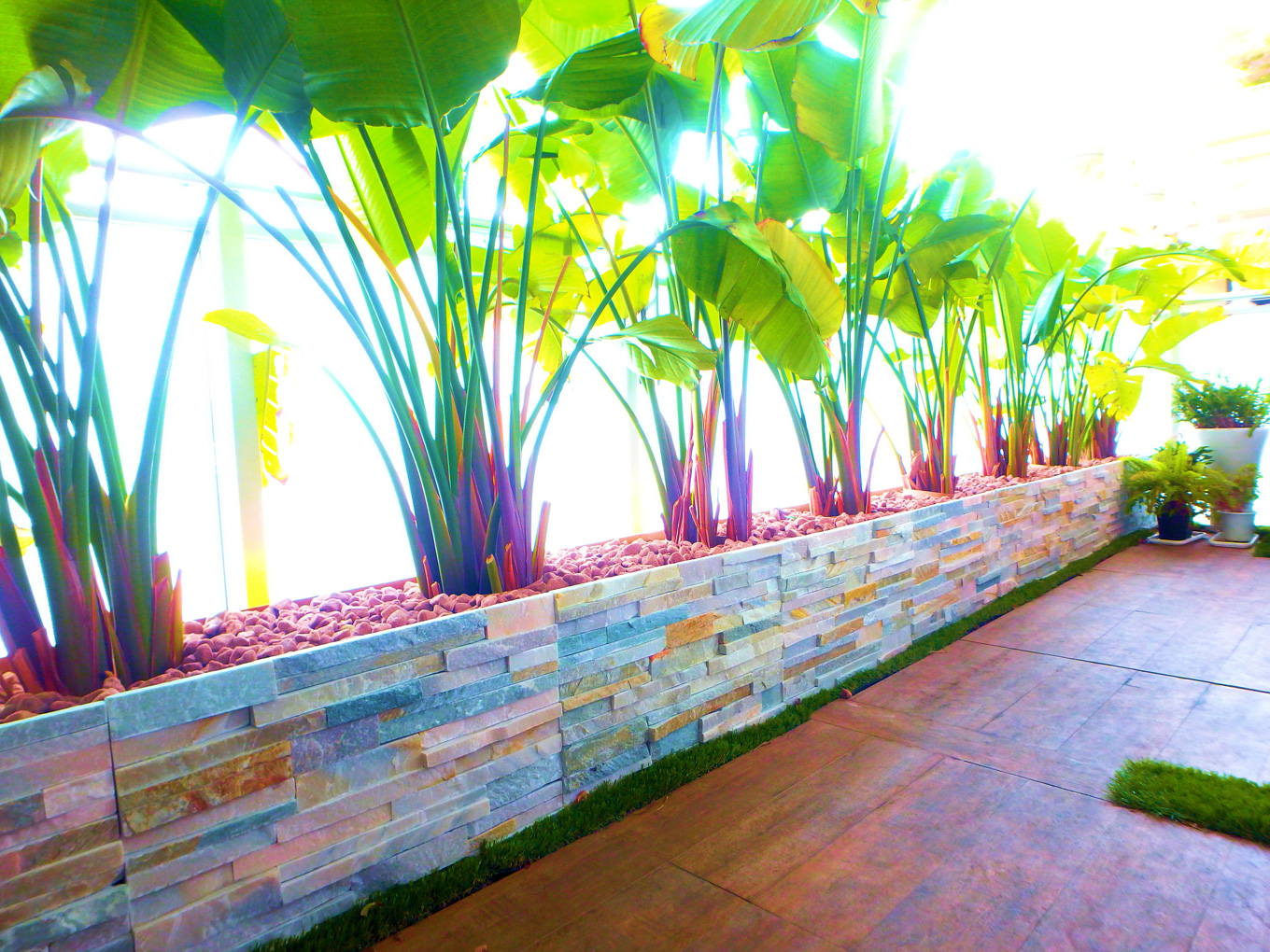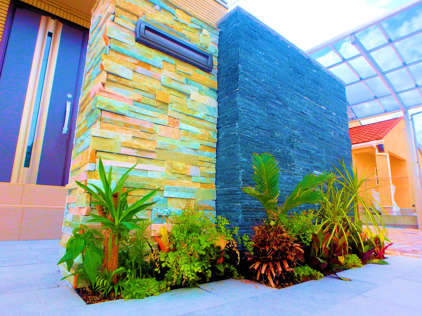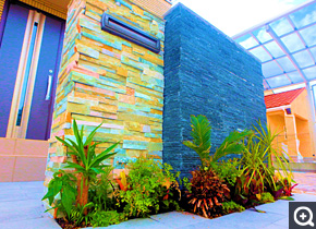限られたスペースでもグリーンディスプレイを楽しんでいただくために、プランターから制作いたします。プランターの表面には、エントランスの壁面などの屋外でも使用できる天然石を施しており、天然石ならではの不規則な凹凸がライティングや昼夜で様々な表情を見せてくれます。