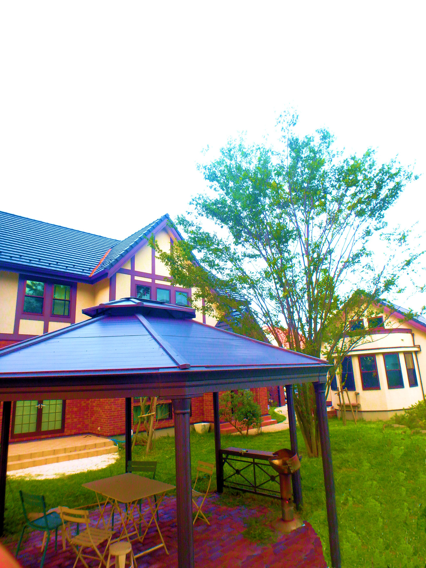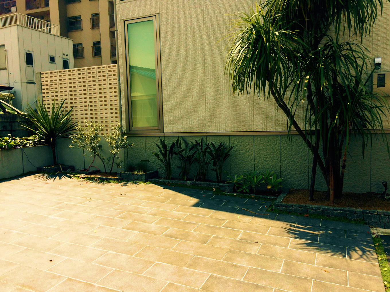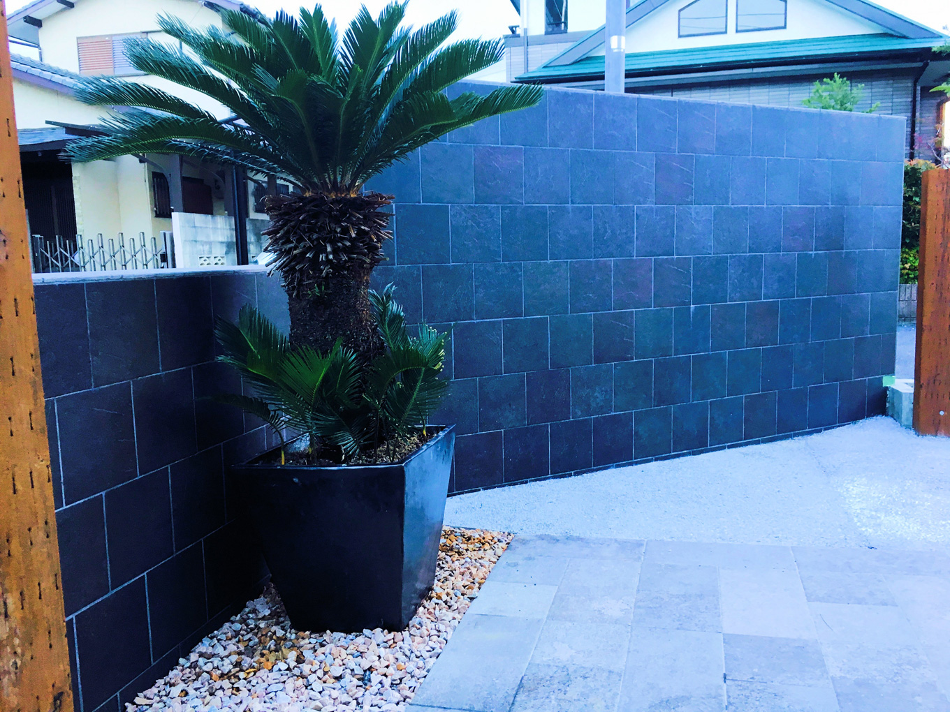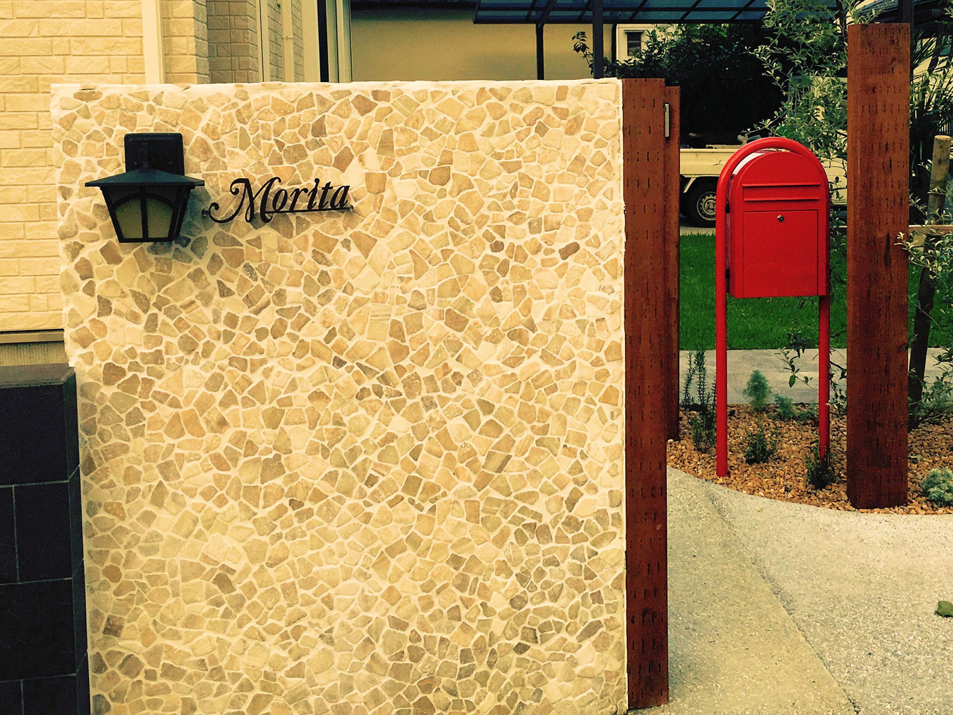 イタリア製の大理石調大判タイルを大胆に取り入れた駐車スペースと美しく野性的なグリーンを調和させたランドスケープづくり。ご家族の過ごした時間の流れとともに、植物の成長を楽しんでいただき、石材やエクステリアアイテムが“レトロ”ではなく“アンティーク”に変化していく様を感じていただけます。